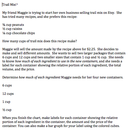Once they saw the fractions, some students groaned. One, Allie, told me that she was deathly afraid of fractions. As she started to work with her group, I saw her try to follow the calculations they started with, working to find the amounts of each ingredient for the 6 cup container. She did not quite engage at this point, but when they found the amount to be 3 cups, 2 cups and 1 cup, Allie blurted out, “It’s 6 parts! And it is always the same!” She grabbed a piece of paper and drew a circle representing one cup, with the ratio of each ingredient in the trail mix. Her group used this representation to solve for the rest of the sizes. They made a ratio table to keep track of their work. They then took centimeter cubes and, calling each one 1/12, made a physical representation of each size showing the consistent ratio.