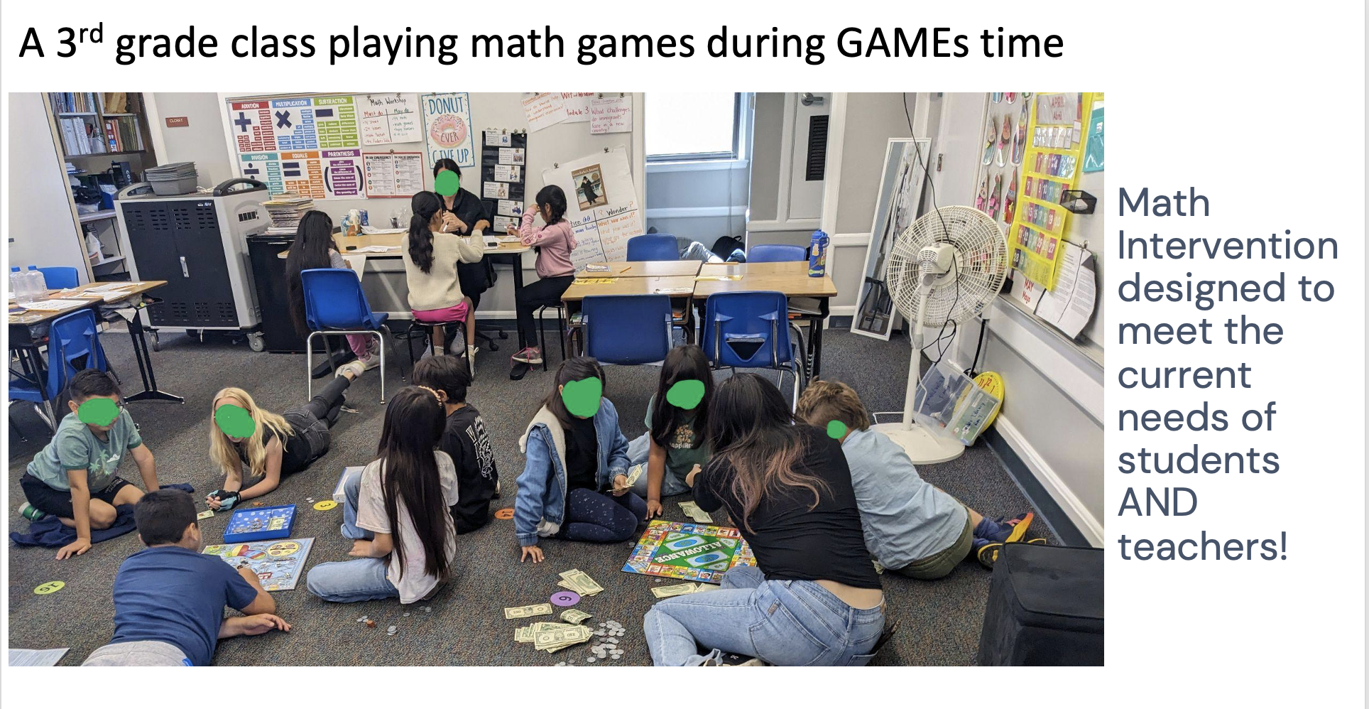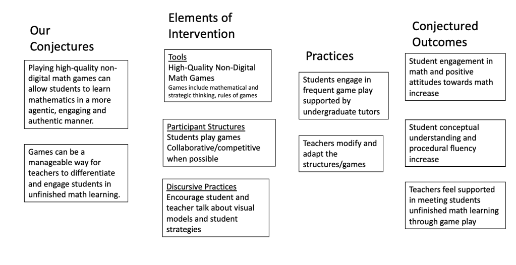 Participating teachers were given a library of 12-15 math games with a short session of game play as professional development. These teachers agreed to allow students to play games for 30 min., twice a week. Undergraduates from UCSB visited the classrooms during those times to play games with students. This data comes from year 2 of the study.